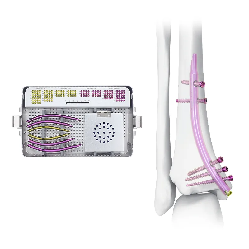 The disinfection box for the distal tibial intramedullary nail is used to store and disinfect the intramedullary nail and related surgical instruments. High-temperature and high-pressure sterilization ensures a sterile environment, and the sealed design prevents contamination. The internal classified partition facilitates the retrieval of instruments and improves surgical efficiency.