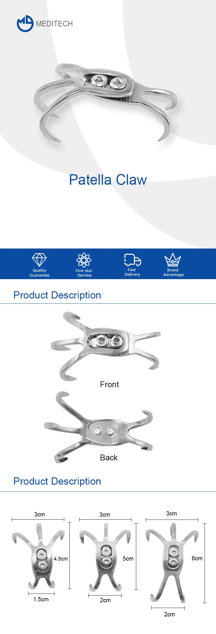 A patella claw is a surgical device that is used to stabilize the patella. It is a small metal plate that is shaped like a claw and is designed to fit over the kneecap. The device is usually made of titanium or stainless steel and is held in place with screws. The patella claw is placed on the front of the kneecap to hold it in place and prevent it from dislocating or moving out of its normal position.