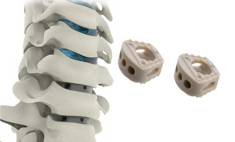 A cervical cage is a medical device used in cervical spine surgery to replace a damaged or diseased intervertebral disc in the neck region. It is a small implant that is designed to fit between two adjacent vertebrae in the cervical spine, and is typically made of a biocompatible material such as titanium, PEEK (polyetheretherketone), or a combination of both.