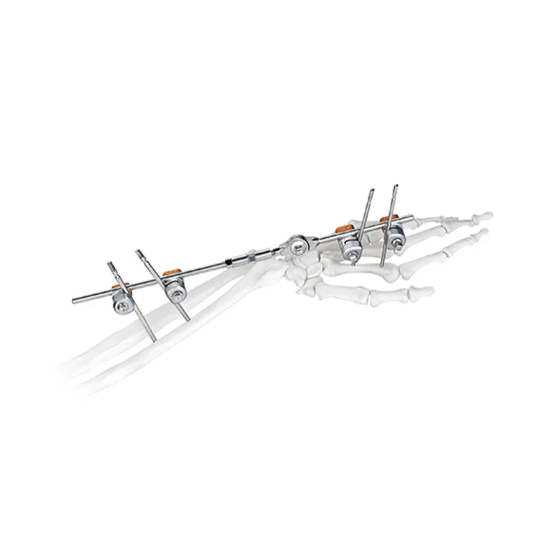 A wrist joint external fixator is a device that is used to stabilize the wrist joint during the healing process following an injury or surgery. It is commonly used in cases of complex fractures, dislocations, or ligament injuries of the wrist joint. The external fixator is placed outside the skin and is attached to the bones using pins or wires, which are inserted through the skin into the bone.