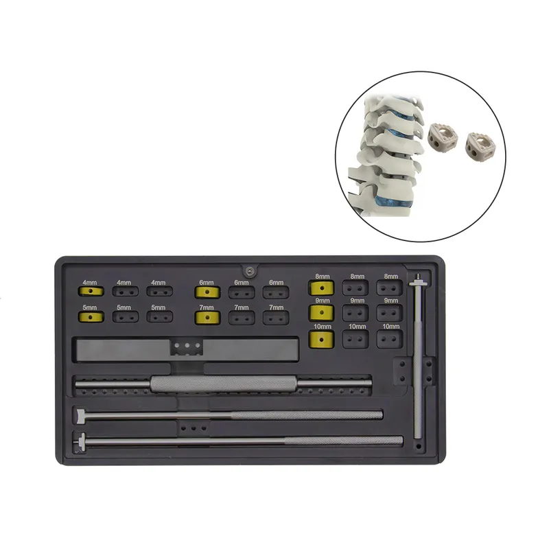 بمجرد تحديد الحجم المناسب، يتم استخدام المُدخل لإدخال جهاز دمج الفقرات العنقية في المساحة المُجهزة. تسمح مجموعة أدوات قفص عنق الرحم بوضع الجهاز بدقة، مما يضمن ملاءمة مثالية ويقلل من خطر حدوث مضاعفات.