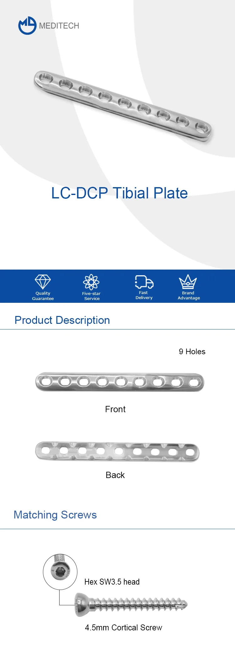 Tibial Pláta caol LC-DCP a mhonaraigh CZMEDITECH chun cnámha fada éagsúla a shocrú, mar an humerus, an femur, agus an tibia. Úsáidtear iad seo freisin chun bristeacha peirea-phróisteacha a shocrú, cnámh osteopenic, agus socrú neamhaontaithe agus maoluithe in othair aosacha.