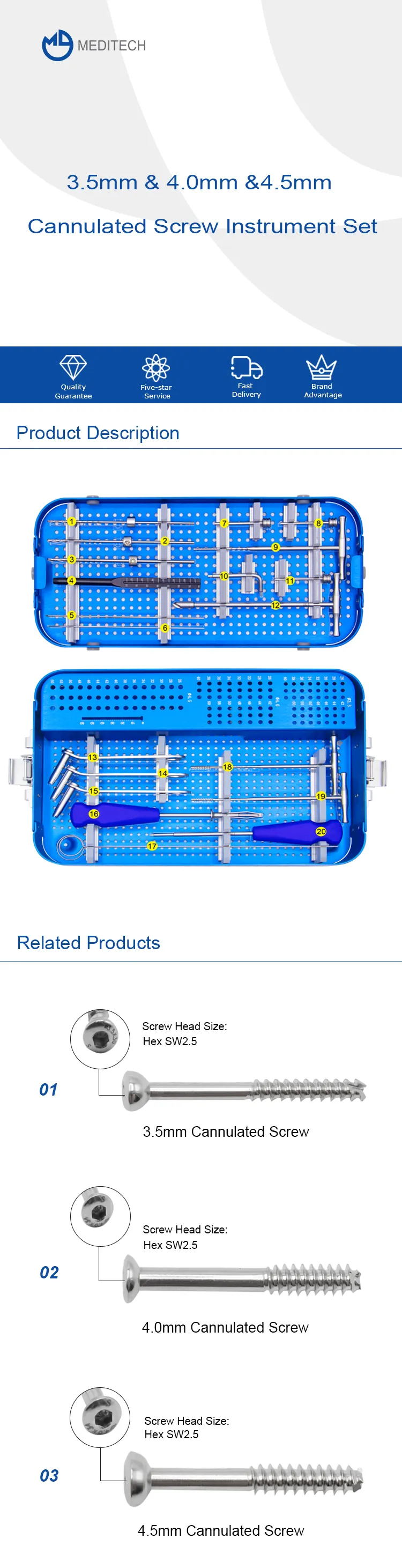 3.5/4.0/4.5mm kannulated screw instrument set screws hamma adda addaa sadii of keessaa qaba, kunis baay'ee kan hojjetuu fi adeemsa baqaqsanii hodhuu bal'aa keessatti fayyadamuuf mijataadha.