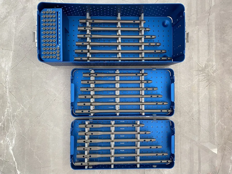 Concluindo, a haste femoral invertida é uma ferramenta crítica em cirurgia ortopédica. Organiza unhas de diversos tamanhos e reduz as chances de erro durante a cirurgia. Os cirurgiões podem escolher entre caixas de pregos fixas e ajustáveis, dependendo dos requisitos do procedimento. A caixa é feita de aço inoxidável, o que a torna durável e resistente à corrosão.