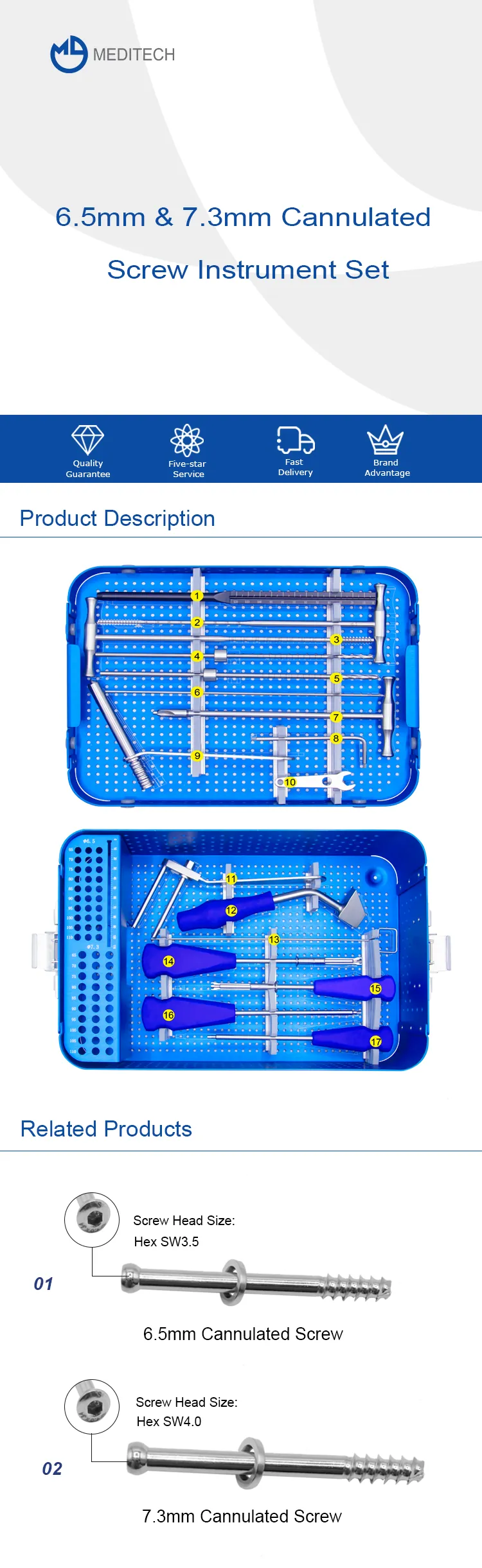 6,5 / 7,3 mm kanalli vintli asboblar to'plami an'anaviy vintlarni kiritish usullariga nisbatan bir qator afzalliklarga ega. Avvalo, kanullangan vintlar minimal invaziv usul yordamida kiritiladi, bu esa kichikroq kesmalar va kamroq to'qimalarning shikastlanishini bildiradi. Bu tezroq shifo vaqtlarini, kamroq chandiqlarni va kamroq asoratlarni keltirib chiqaradi. Kanullangan vintlar, shuningdek, mukammal mahkamlash va barqarorlikni ta'minlaydigan kuchli va bardoshli bo'lish uchun mo'ljallangan.